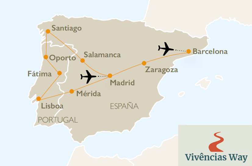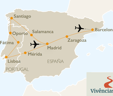 Almoço em Barcelona · Jantar de Tapas em Madri · Almoço em Toledo · Jantar em Salamanca · Jantar em Santiago · Almoço em Porto · Almoço em Fátima · Jantar em Lisboa (Fado) · Almoço em Mérida · Jantar em Barcelona