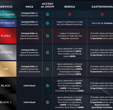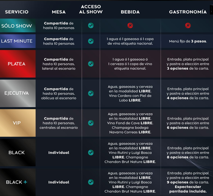 ** Em todos os níveis de serviço, com exceção da categoria “ Sólo Show (Somente Show)”, está incluído o acesso ao FreePlay do Casino Buenos Aires.
