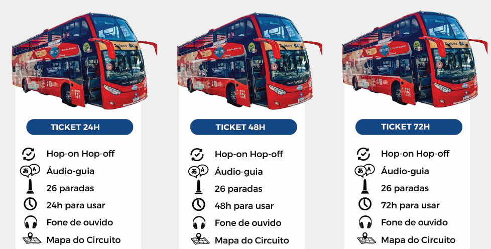 ** Apesar do ticket ser de 24h, 48h e 72h, o BUS só circula das 09:00 às 18:00 horas.