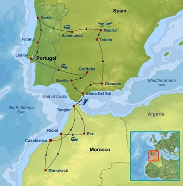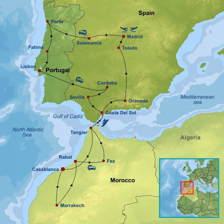 A jornada começa em Madri, passa pelas cidades históricas de Salamanca, Porto, Fátima e Lisboa, cruza a Andaluzia por Córdoba e Sevilha, atravessa o Estreito de Gibraltar até Tânger, e segue por Fez, Marrakech e Casablanca — antes de retornar à ensolarada Costa del Sol, Granada e Toledo.